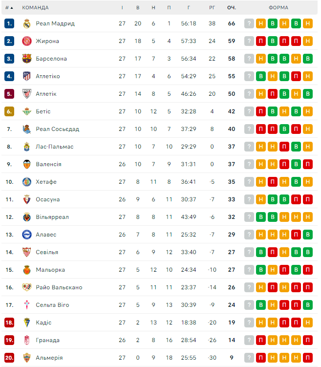 Топ-5 чемпионата Испании: Реал Мадрид (66), Жирона (59), Барселона (58), Атлетико М (55), Атлетик Б (50).