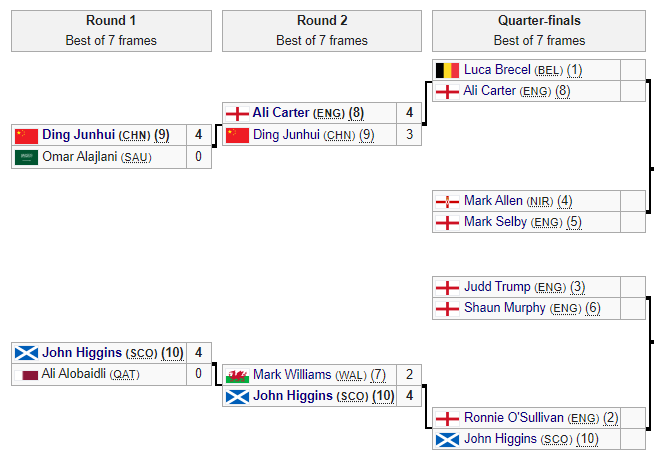 - Марк Уильямс (Уэльс) – Джон Хиггинс (Шотландия) – 2:4