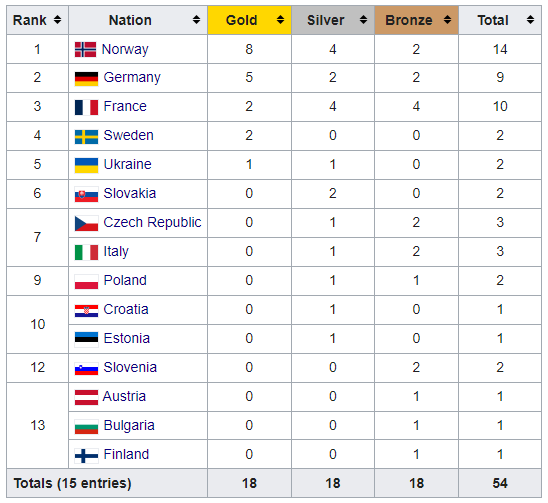 В топ-5 медального зачета вошли: Норвегия (8–4–2), Германия (5–2–2), Франция (2–4–4), Швеция (2–0–0), Украина (1–1–0).