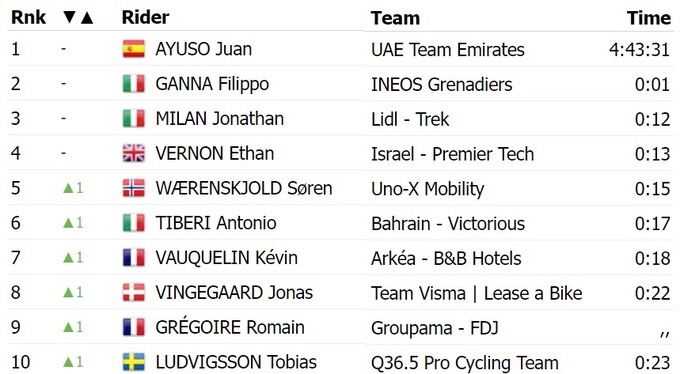 Лидером общего зачета остался испанец Хуан Аюсо из «UAE Emirates», который вчера выиграл разделку на первом этапе.