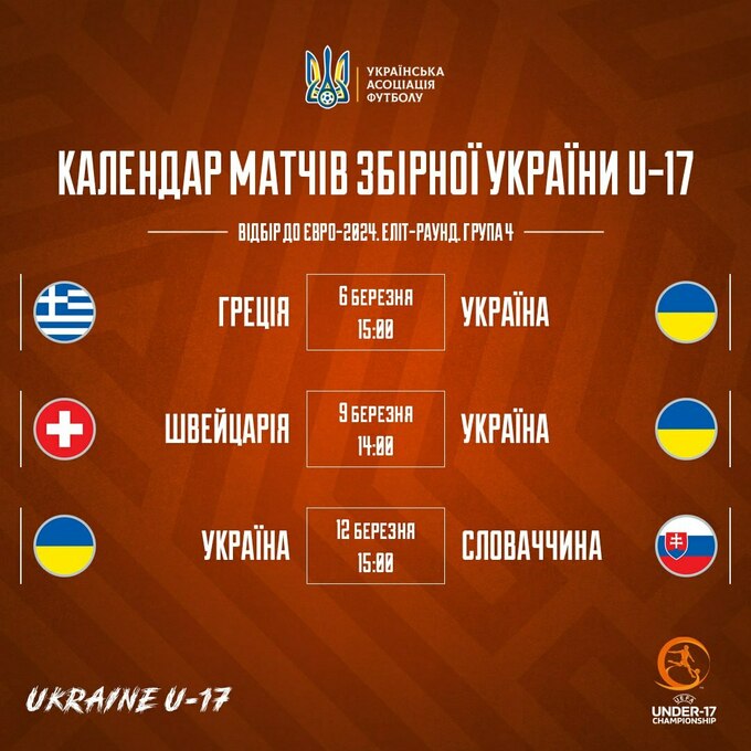 6 марта юношеская сборная Украины U-17 стартует в элит-раунде отбора на Евро-2024 U-17, финальный раунд которого пройдет с 20 мая по 5 июня на Кипре.