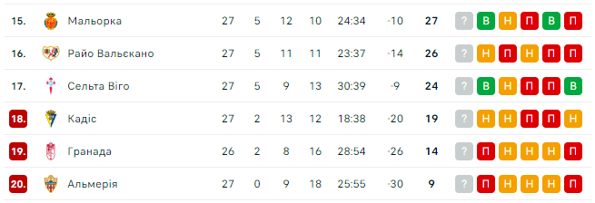 Имея 9 очков, красно-белая команда занимает последнее, 20-е место в Ла Лиге.