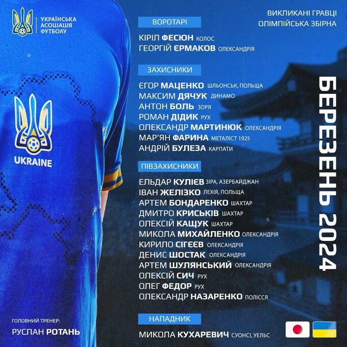 Главный тренер олимпийской сборной Украины Руслан Ротань определился с составом команды на тренировочный сбор в венгерском Сегеде (17–27 марта) и товарищеский матч против Японии в Фукуоке (25 марта):