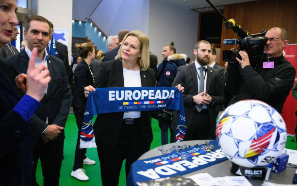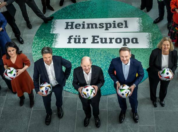 В Германии провели небольшую церемонию начала отсчета 100 дней до старта Евро-2024. Мероприятие посетил канцлер Германии Олаф Шольц и другие известные политики, функционеры и спортсмены.
