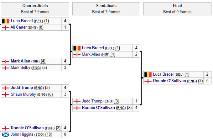 Ранее в полуфинале Люка Бресель обыграл Марка Аллена со счетом 4:2. В битве принципиальных соперников Ронни О'Салливан одержал победу над Джаддом Трампом со счетом 4:1.