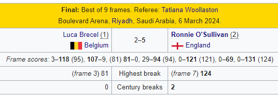 Англичанин Ронни О'Салливан обыграл бельгийца Люку Бреселя (5:2) и стал первым победителем турнира World Masters of Snooker в саудовском Эр-Рияде.