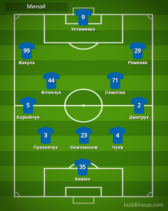 «Минай»: Кемкин – Корнийчук, Прокопчук, Немчанинов, Чуев (Кисель, 82), Дмитрук (Кораблин, 46) – Семотюк (Гуничев, 70), Витенчук – Вакула, Устименко (Демиденко, 82), Ременяк (Матюшенко, 70).