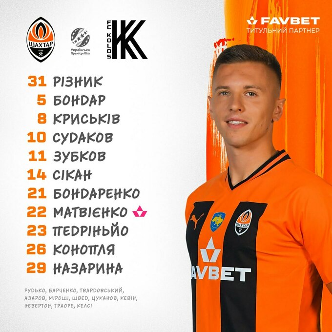 «Шахтер»: Ризнык, Конопля, Бондарь, Матвиенко, Педриньо, Бондаренко, Крыськив, Зубков, Назарина, Судаков, Сикан.