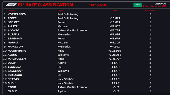 Состоялась гонка в рамках второго этапа Формулы-1 в Саудовской Аравии. Заезд выиграл пилот Ред Булла Макс Ферстаппен, который стартовал с поула и традиционно не имел проблем.