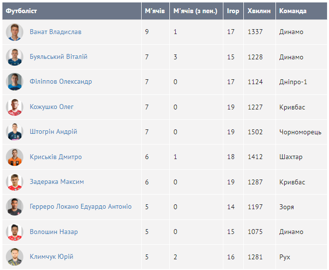 Нападающий «Динамо» Владислав Ванат возглавляет рейтинг, имея 9 голов и 6 ассистов (15 результативных действий).