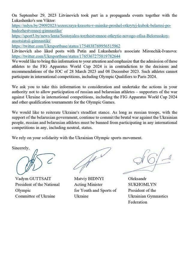 Президент Национального олимпийского комитета Украины Вадим Гутцайт, и.о. Министра молодежи и спорта Украины Матвей Бидный и президент Федерации гимнастики Украины Александр Сухомлин обратились в МОК и Международную федерацию гимнастики (FIG) и указали на нарушение рекомендаций МОК о нейтралитете спортсменов из стран-агрессоров, допущенных к международным соревнованиям.