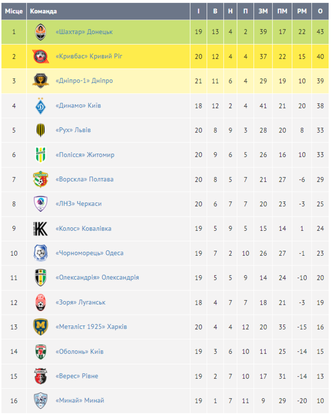 Донецкий «Шахтер» обыграл «Минай» (2:0) и укрепил лидерство (43 очка и две игры в запасе). Криворожский «Кривбасс» идет на втором месте (40 баллов и игра в запасе).