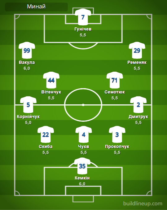 «Минай»: Кемкин – Корнийчук (Кораблин, 46), Скиба, Чуев, Прокопчук, Дмитрук – Петько, Витенчук (Семотюк, 64) – Вакула (Тищук, 85), Гуничев (Устименко, 74), Ременяк (Попов, 73).