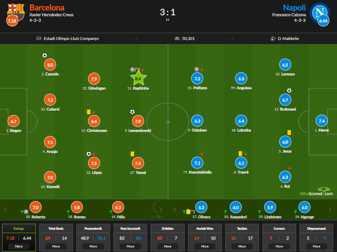 Рафинья стал лучшим игроком матча Барселона – Наполи по версии WhoScored