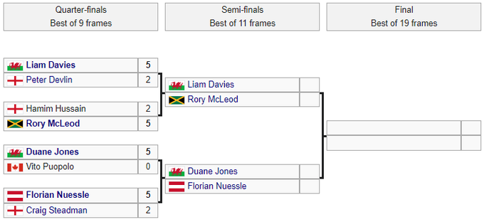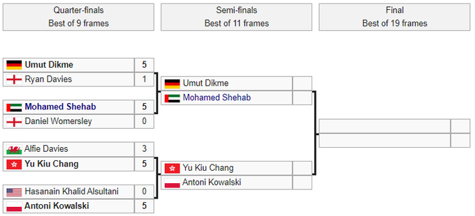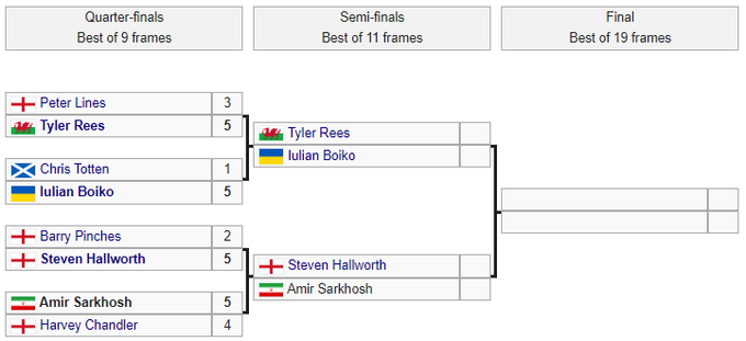 14 марта в полуфинале украинец сыграет против Тайлера Риса из Уэльса, который победил Питера Лайнса из Англии (5:3). Игра в полуфинале будет идти до 6 побед в фреймах, а в финале – до 10.