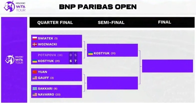 В 1/2 финала Костюк сразится против Иги Свёнтек (№1 WTA) или Каролин Возняцки (№204 WTA). Для Марты это будет первый полуфинал турнира такой категории.