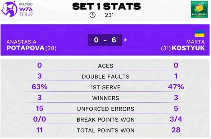 Марта Костюк (Украина) [31] – Анастасия Потапова [28] – 6:0, 7:5