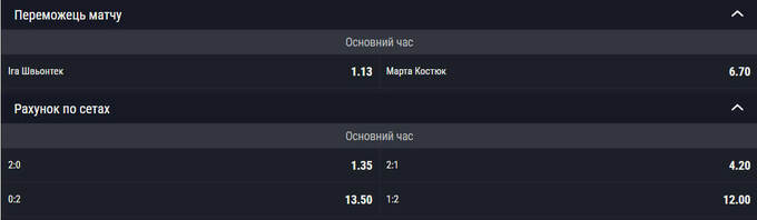 Основные котировки на матч Ига Свентек – Марта Костюк: