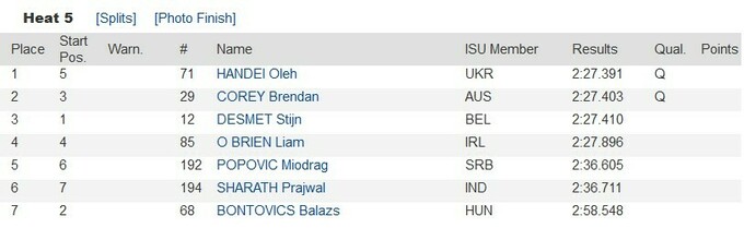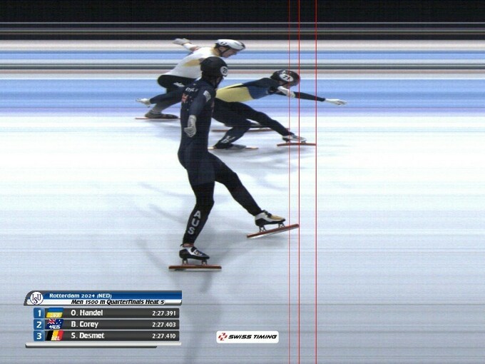 В четвертьфинальном забеге Гандей финишировал первым, удержав лидерство на финише. Вторым стал австралийский шорт-трекист Брэндан Кори, который также прошел в полуфинал. Бронзовый призер чемпионата мира 2022 на самой длинной дистанции, бельгиец Стейн Десмет занял третье место и будет пытаться отобраться в полуфинал через забеги Repechage.