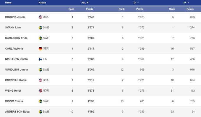 Закономерная победа американки, но прямо сейчас фаворитом общего зачета на следующий сезон выглядит уже Сван. Шведка в полной мере восстановилась после своих травм и вернулась к оптимальной форме уже по ходу нынешнего сезона. И, если в следующей зимней кампании она будет в таких кондициях с самого начала, то остановить ее будет очень трудно. Хотя не забываем, что следующий сезон – сезон чемпионата мира в Тронхейме, и там многое будет зависеть от того, кто как расставит свои приоритеты. А Диггинс ранее никогда от борьбы за общий зачет добровольно не отказывалась.