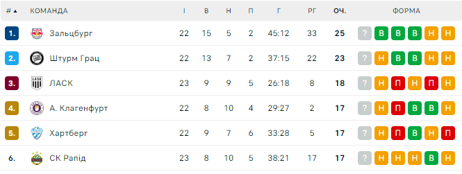Команда украинца набрала 18 очков и занимает третье место в турнирной таблице топ-6 чемпионата Австрии. Лидируют РБ Зальцбург (25) и Штурм Грац (23).
