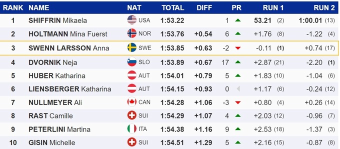 Американка более чем на полсекунды опередила норвежку Мину Фюрст Хольтманн. Топ-3 замкнула шведка Анна Свенн-Ларссон, которая лидировала после первой попытки.