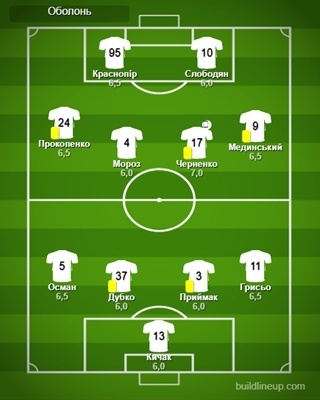 Замены «Оболони»: Косовский – 6,0, Суханов – 6,0, Тарануха – 6,0, Лукьянчук – 6,0, Запорожец – 6,0.