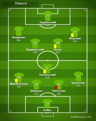 Прокопенко, 7, Черненко, 23, Дубко, 45, Грисьо, 58, Приймак, 70, Медынский, 84 - Козак, 50, Танковский, 51, Михайличенко, 56, Фортюне, 57
