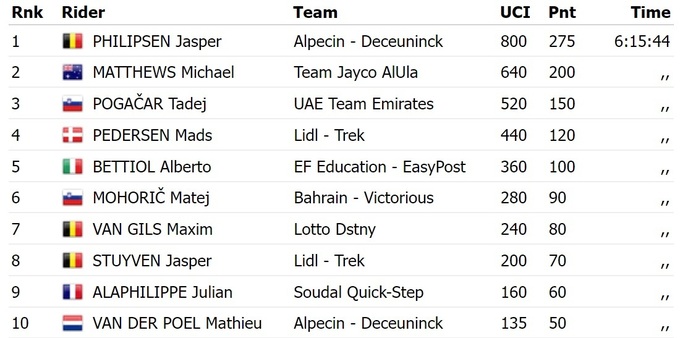 В финишном спринте Филипсен опередил австралийца Майкла Мэттьюза из «Jayco AlUla» и словенца Тадея Погачара из «UAE Emirates».
