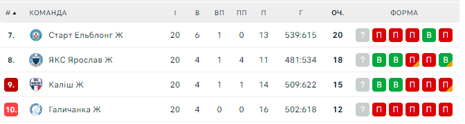 Галичанка занимает последнюю, 10-ю позицию в пульке за 7–10 места, имея 12 очков (4 победы и 16 поражений).