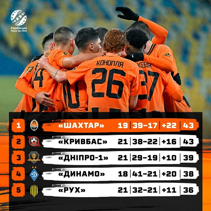 «Шахтер» лидирует, «Кривбасс» идет на 2-м месте, обе команды имеют по 43 очка