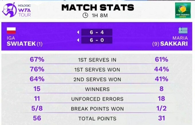 Примечательно, что 2 года назад Свентек и Саккари также играли в финале на кортах Индиан-Уэллса. Тогда победу в двух сетах одержала полька со счетом 6:4, 6:1 – Мария сумела взять только на 1 гейм больше...