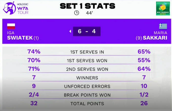 Свентек выиграла 73-й матч, в котором она сумела взять как минимум один сет со счетом 6:0.