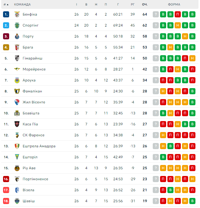 «Бенфика» вышла на первое место (64 очко), опередив «Спортинг» (62 балла). «Порту» идет 3-м, набрав 58 очков.