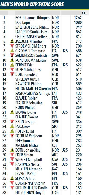 Йоханнес Бё досрочно выиграл общий зачет Кубка мира в 5-й раз за 6 последних лет и стал главным триумфатором сезона 2023/24. В пятерку лучших общего зачета вошли только норвежцы: Йоханнес Бё, Тарьей Бё, Йоханнес Дале-Шевдаль, Стурла Легрейд, Ветле Шостад Кристиансен.