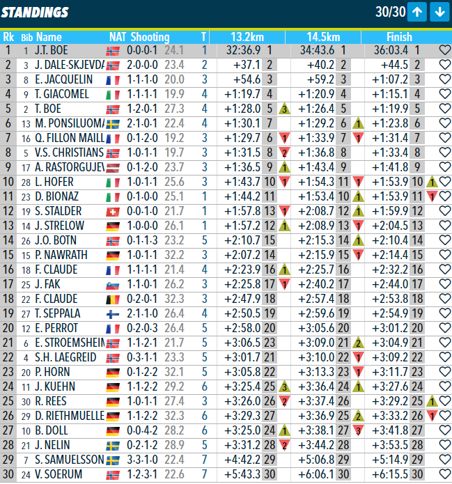 - 1. Йоханнес Бе (Норвегия) – 36:03,4 (0+0+0+1)