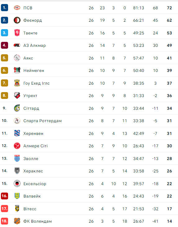ПСВ дома минимально одолел «Твенте». Также минимальный триумф праздновал и «Фейеноорд». Ещё один лидер АЗ покуражился в матче с «Волендамом». Главный аутсайдер сезона на своем поле пропустил четыре гола.