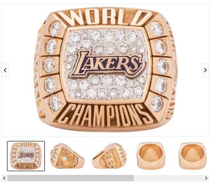 Чемпионский перстень в 2000 году стал для Коби первым в карьере. Впоследствии он сделал его точную копию и подарил своему отцу Джо Брайанту. Отмечается, что вес перстня составляет примерно 59,6 грамма. В общей сложности он украшен 40 бриллиантами. Аукцион завершится 30 марта. На данный момент цена лота составляет 94 тысячи долларов.