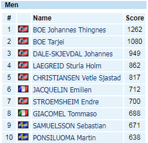 Что же касается самого масс-старта, нужно отдать должное Дале. Североамериканские этапы оказались для него неудачными, вот и в этой гонке Йоханнес стартовал с двух промахов на первой стрельбе. Однако собрался, закрыл все оставшиеся мишени и финишировал вторым, отстав в итоге всего на три очка от Бё-младшего в зачете масс-стартов. Третью позицию занял Эмильен Жаклен с тремя промахами. Француз выдал солидную вторую половину сезона после совершенно невнятной первой, благодаря чему стал в общем зачете первым после норвежцев. Правда, это только шестое место.