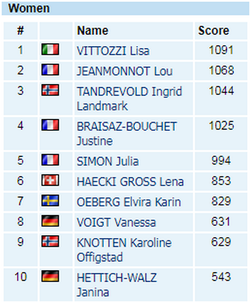 Благодаря блестяще проведенному спринту, Виттоцци сократила отставание в общем зачете от Тандреволд до семи очков. То есть, отыграла 66 пунктов за одну гонку накануне персьюта, где должна была стартовать с минутным гандикапом по сравнению с главной соперницей!