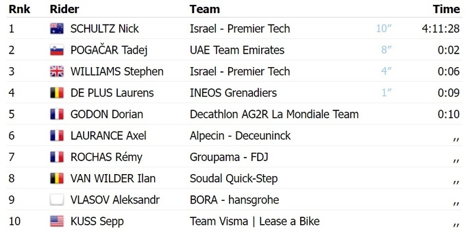 Вторым благодаря спринту из пелотона финишировал словенец Тадей Погачар из «UAE Emirates». Топ-3 замкнул еще один гонщик «Israel Premier Tech», британец Стивен Уильямс.