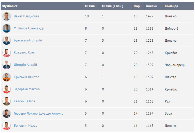 Нападающий «Динамо» Владислав Ванат возглавляет рейтинг, имея 10 голов и 6 ассистов (16 результативных действий). На прошлой неделе он забил гол в ворота Зари (2:0).