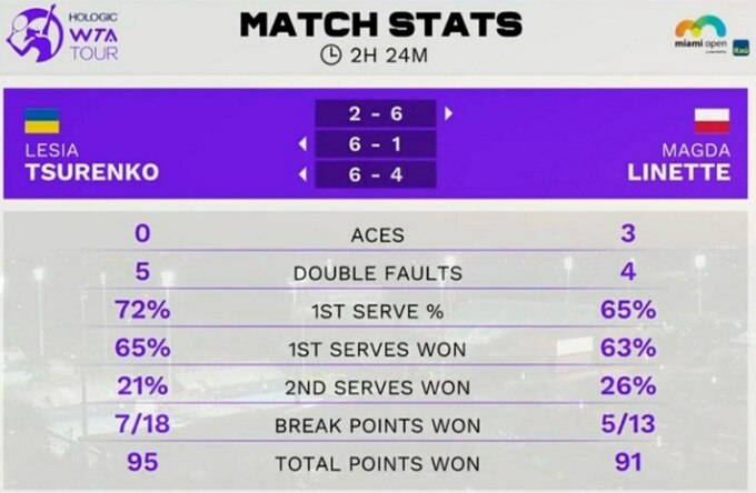 Леся Цуренко (Украина) – Магда Линетт (Польша) – 2:6, 6:1, 6:4