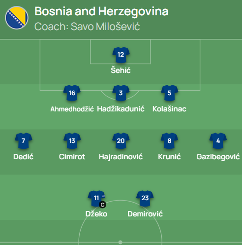 Босния и Герцеговина: Шехич – Ахмедходжич, Хаджикадунич, Колашинац – Дедич, Симирот, Хайрадинович, Крунич, Газибегович – Джеко, Демирович.