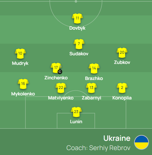 Украина: Лунин – Конопля, Забарный, Матвиенко, Миколенко – Судаков, Бражко, Зинченко – Зубков, Довбик, Мудрик