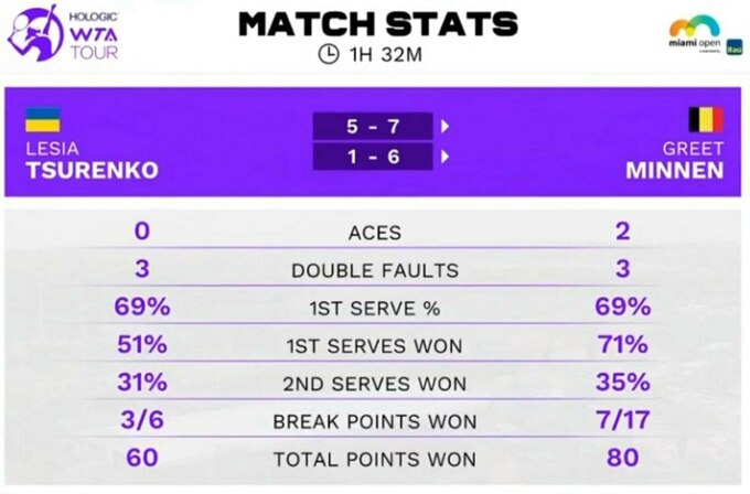 В 1/32 финала престижных соревнований украинка в двух сетах проиграла Грет Миннен (Бельгия, WTA 79) за 1 час и 32 минуты.