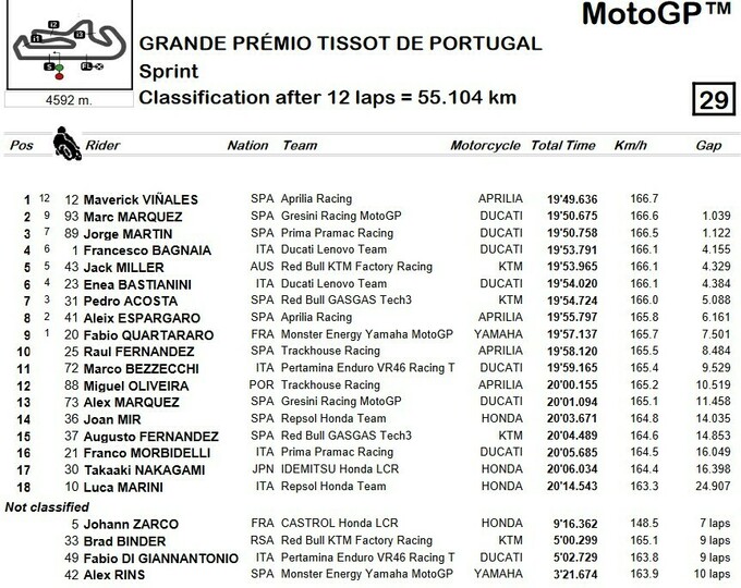 Маверик Виньялес из команды Априлия одержал победу в спринте Гран-при Португалии. Испанец не очень хорошо провел старт и на какое-то время опустился на четвертую позицию. Но уже на пятом круге он вернулся на второе место, а вскоре ошибся лидировавший действующий чемпион мира Франческо Баньяйя и Виньялес без проблем довел гонку до своей победы, первой со времен Гран-при Катара 2021.