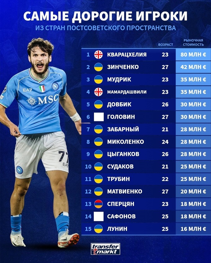 Среди игроков из стран постсоветского пространства лидером является грузинский футболист Хвича Кварацхелия из Наполи (80 млн евро).