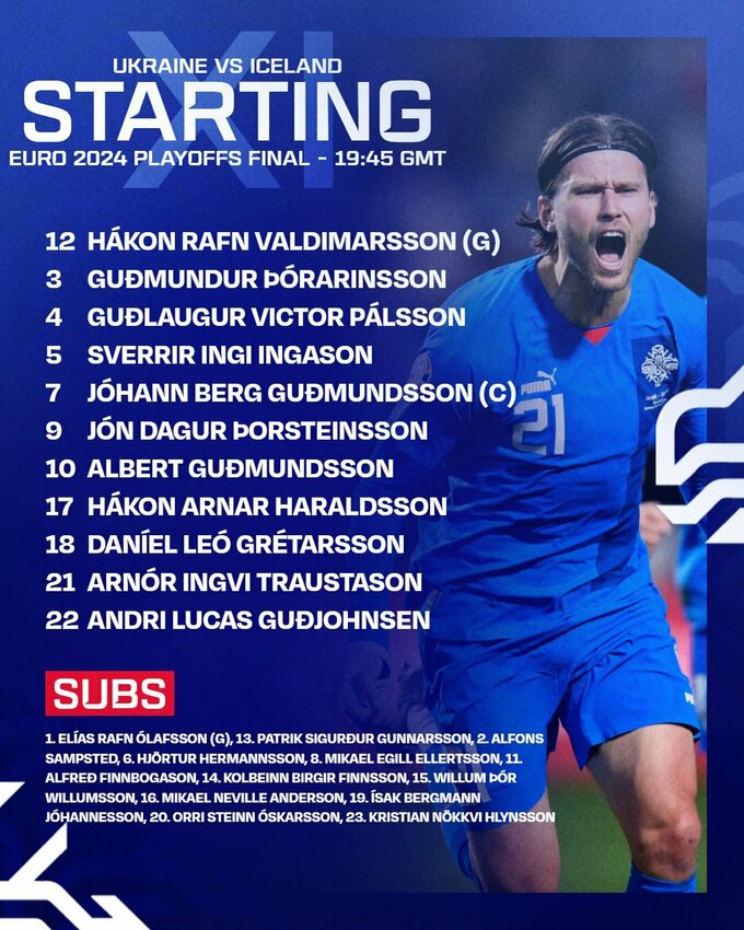 Исландия: Вальдимарссон, Тораринссон, Пальссон, Ингасон, Й. Гудмундссон, Торстейнссон, А. Гудмундссон, Харальдссон, Гретарссон, Траустасон, А. Гудьонсен