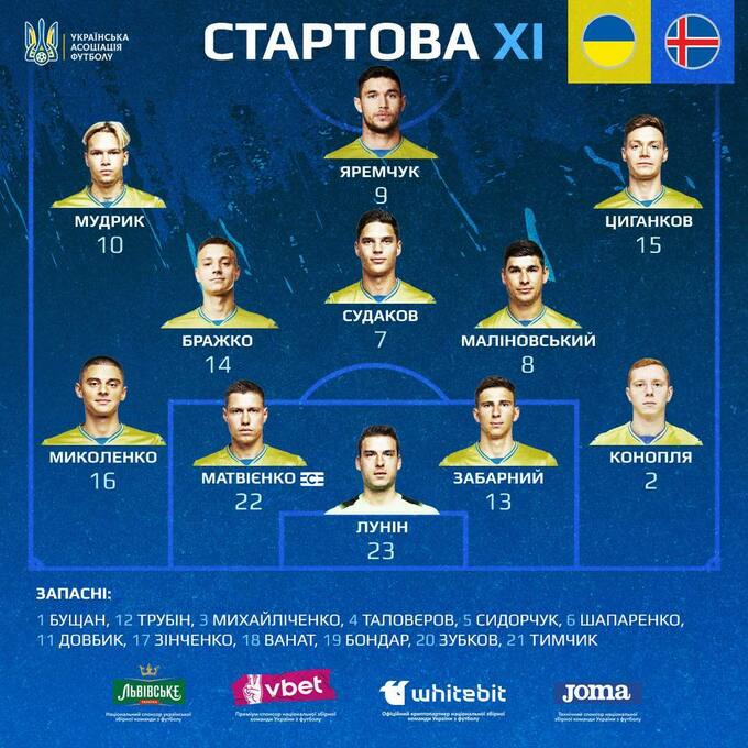 Украина: Лунин – Миколенко, Матвиенко, Забарный, Конопля – Бражко, Судаков, Малиновский – Мудрик, Цыганков, Яремчук.